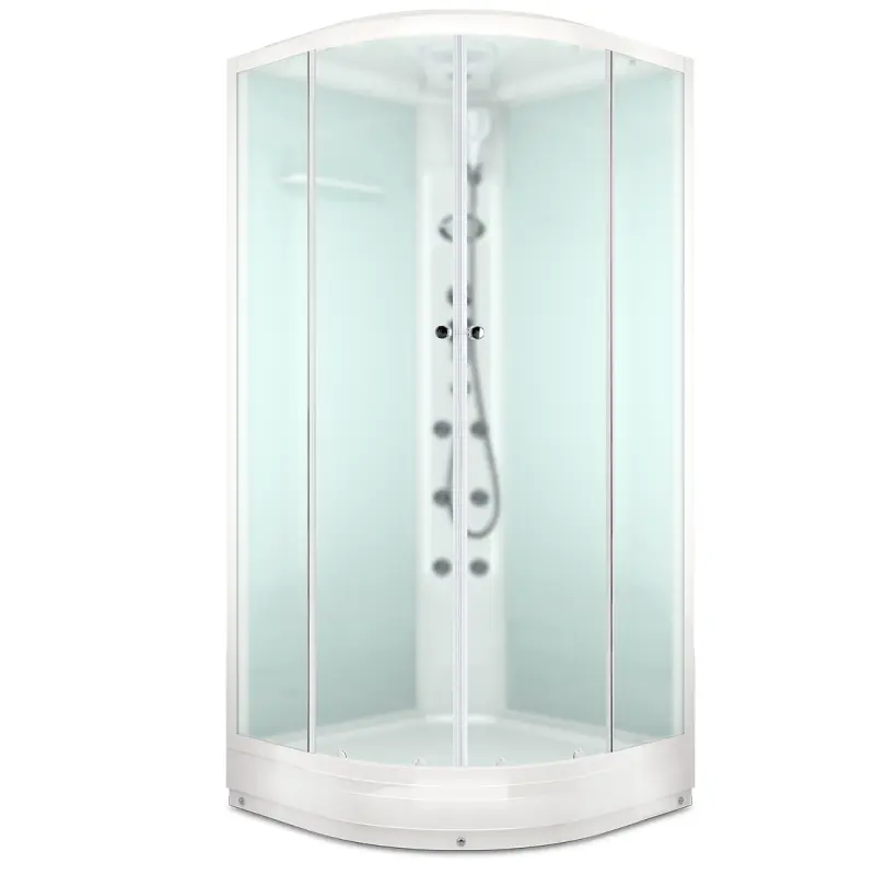 Душевая кабина Domani-Spa Delight Slim имеет размеры 90х90х218 см. Форма — четверть круга, цвет белый, исполнение полотна двери матовое. Механизм открывания раздвижной. Поддон низкий и стеклянная белая задняя панель.