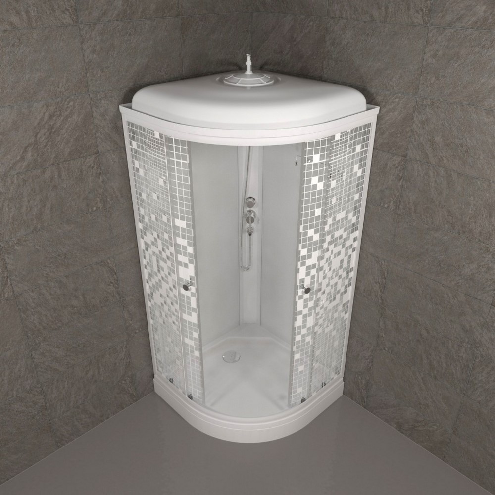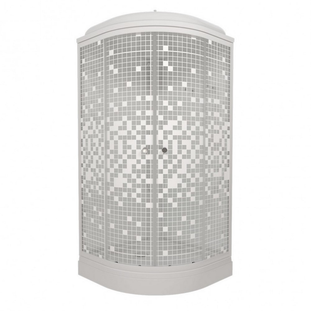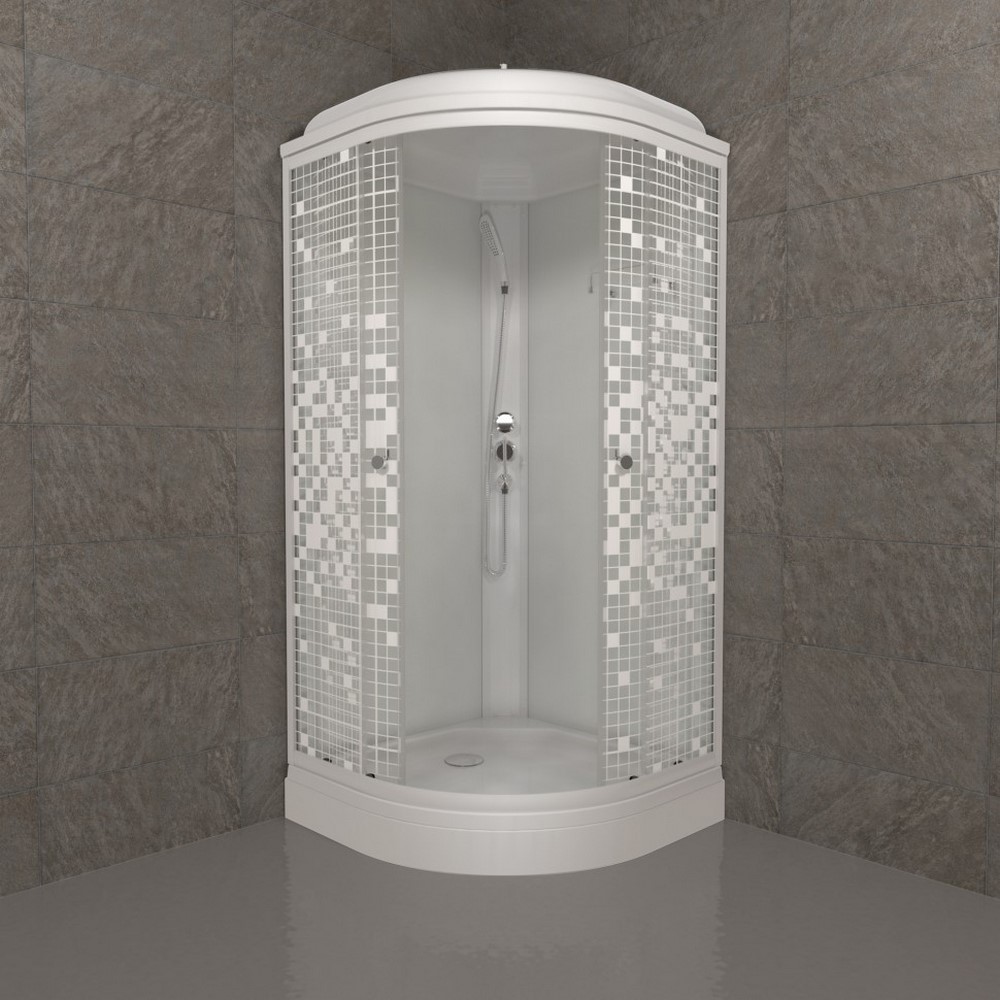Душевая кабина Triton Мозайка А имеет размеры 90х90 см. Форма — четверть круга, цвет белый, исполнение полотна двери с рисунком. Механизм открывания раздвижной. Низкий поддон.