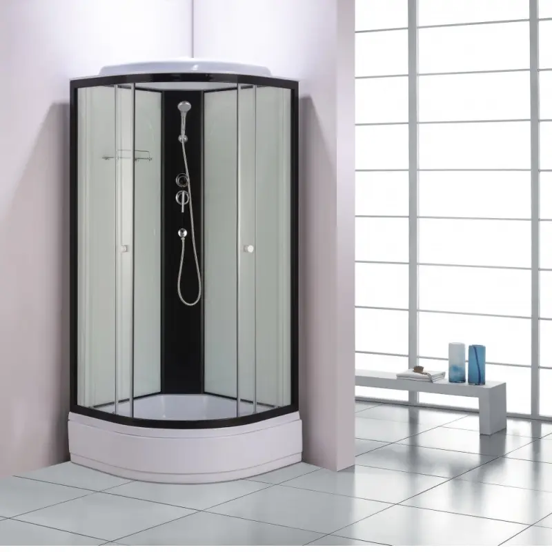 Душевая кабина Водный мир имеет размер 100х100 см. Форма — четверть круга , цвет черный, исполнение полотна двери прозрачное. Механизм открывания раздвижной.