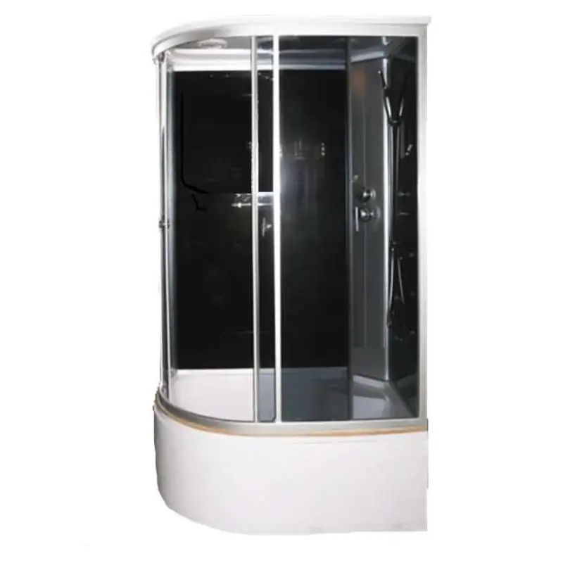 Душевая кабина Водный мир правая имеет размер 120х80 см. Форма — асимметричная , цвет хром, исполнение полотна двери тонированное. Механизм открывания раздвижной.