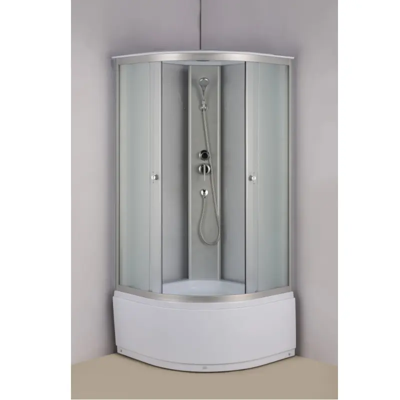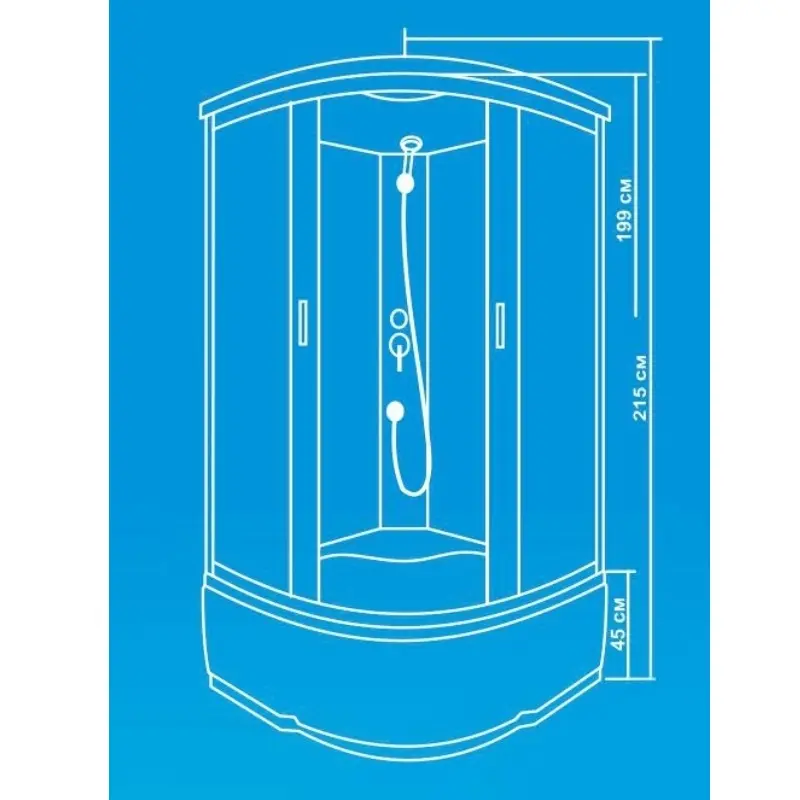 Душевая кабина Водный мир имеет размер 80х80 см. Форма — четверть круга , цвет хром, исполнение полотна двери матовое. Механизм открывания раздвижной.