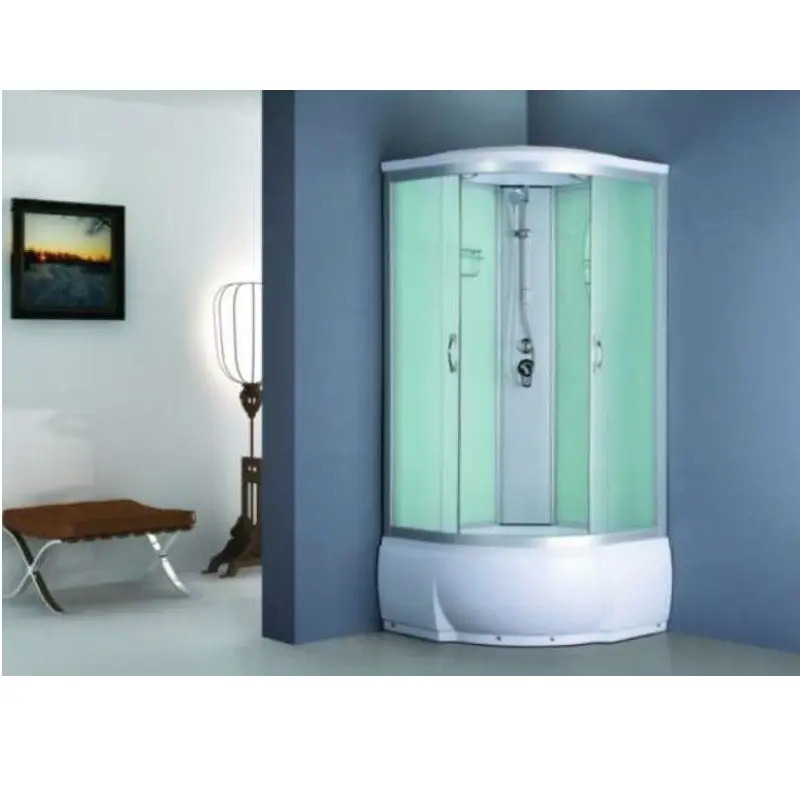 Душевая кабина Водный мир имеет размер 80х80 см. Форма — четверть круга , цвет хром, исполнение полотна двери матовое. Механизм открывания раздвижной.