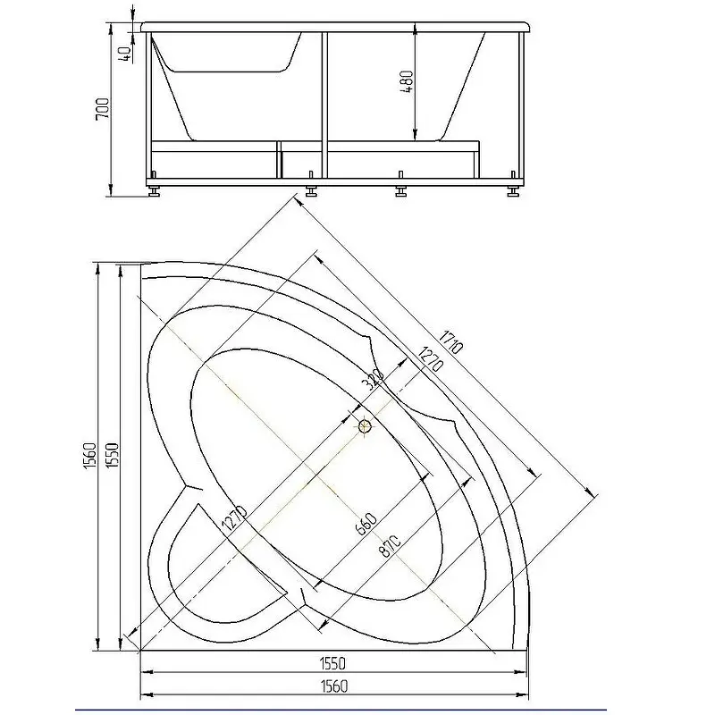 Ванна акриловая Акватек Поларис-2 155х155 (каркас + слив-перелив + экран)